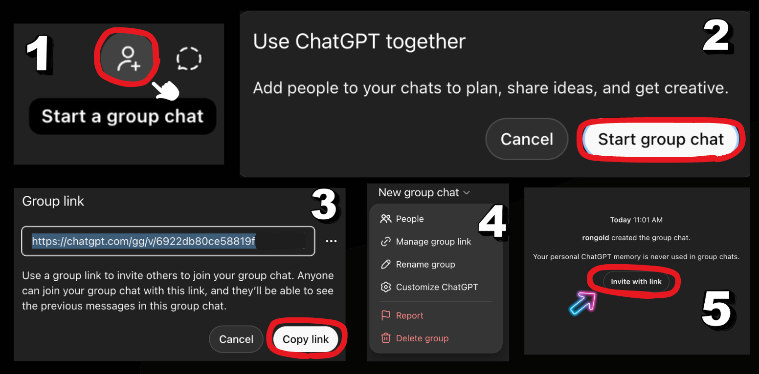 הקמה של צ’אט קבוצתי ב-ChatGPT היא תהליך מהיר וברור, והמסכים עצמם מנחים אתכם שלב אחרי שלב.