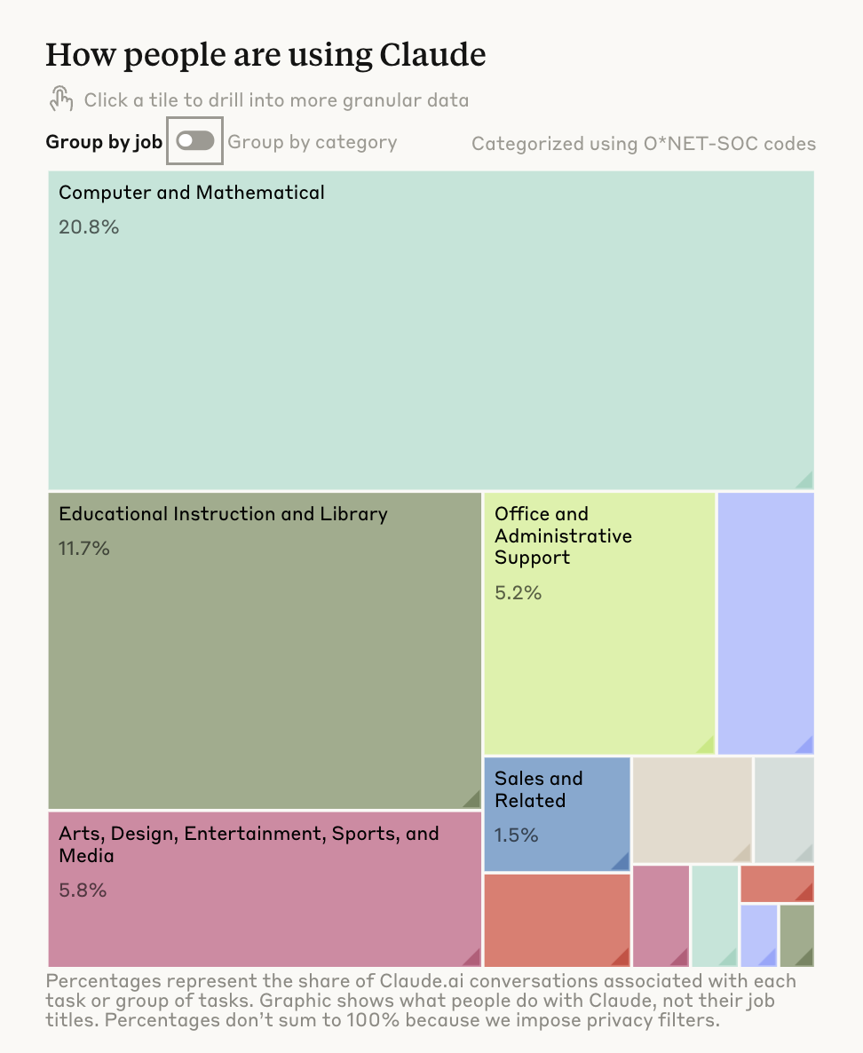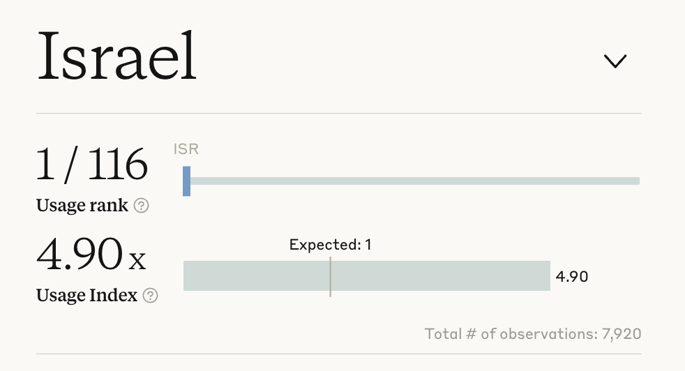 הדוח של אנטרופיק מצביע על כך שמדינות עם שיעור גבוה של עובדים בקטגוריית Computer & Mathematical משתמשות יותר ב‑Claude. ישראל פשוט נמצאת בקצה העליון של הסקאלה הזו.
