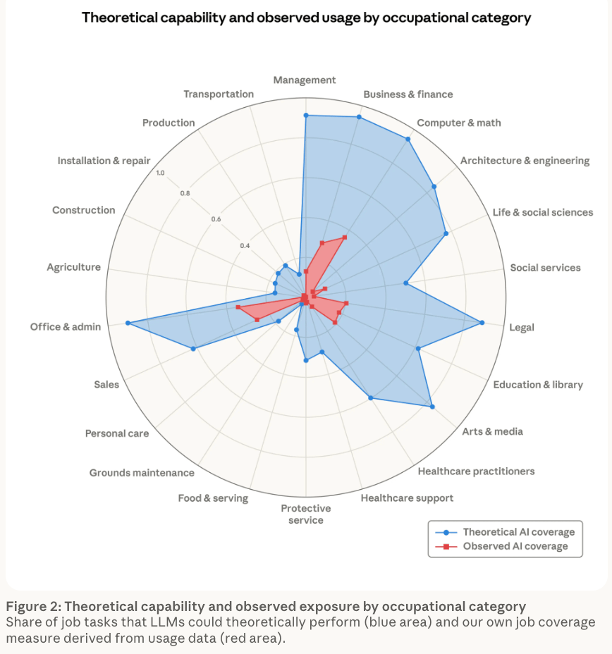 כפי שמנסחת זאת אנטרופיק: “ה‑AI עדיין רחוק מלממש את היכולות התאורטיות שלו. השימוש בפועל מכסה רק חלק קטן ממה שאפשרי מבחינה טכנולוגית.” הפער בין הכחול, שמייצג יכולת, לבין האדום, שמייצג שימוש בפועל, הוא לב הסיפור שהמחקר מבקש להדגיש.