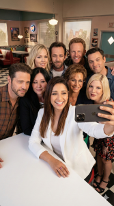 I'm taking a selfie with The main actors from the film on the set of (movie) while holding a glass of wine and making a toast. Keep the person exactly as shown in the reference image with 100% identical facial features... [המשך הפרומפט הרגיל]