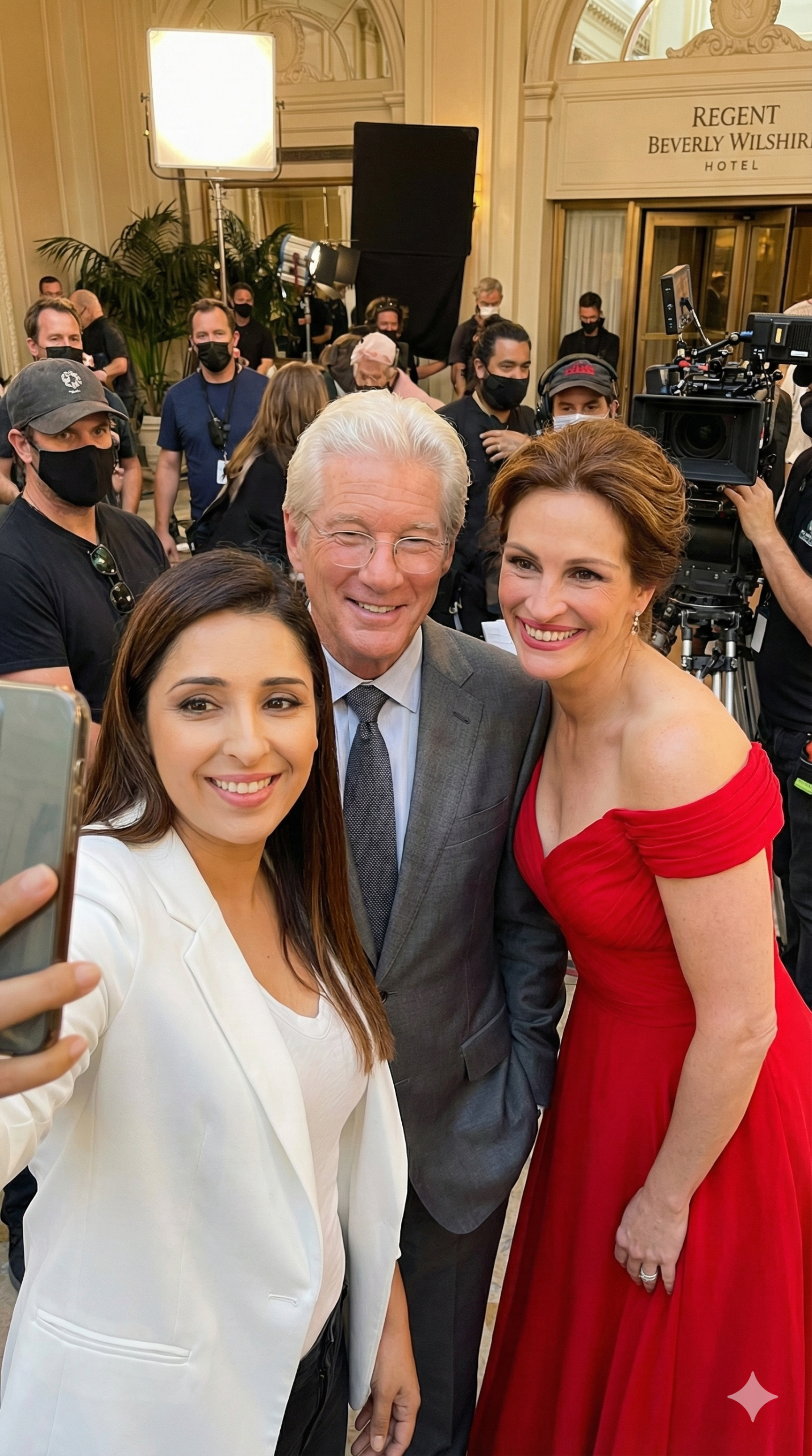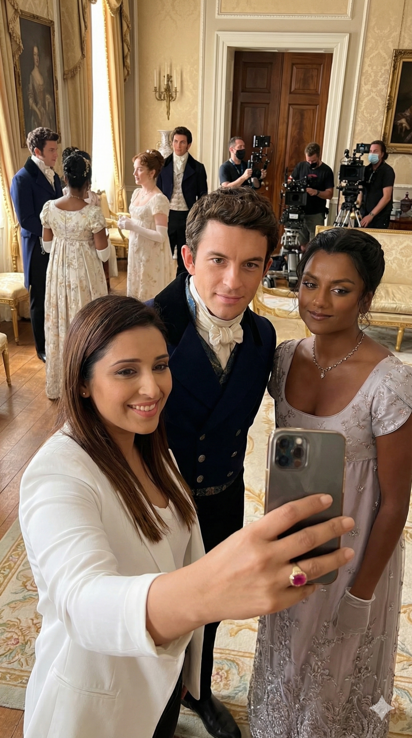 I'm taking a selfie with the main actors from the film on the set of (movie). Keep the person exactly as shown in the reference image with 100% identical facial features, bone structure, skin tone, facial expression, pose, and appearance. 9:16 aspect ratio, 4k detail.