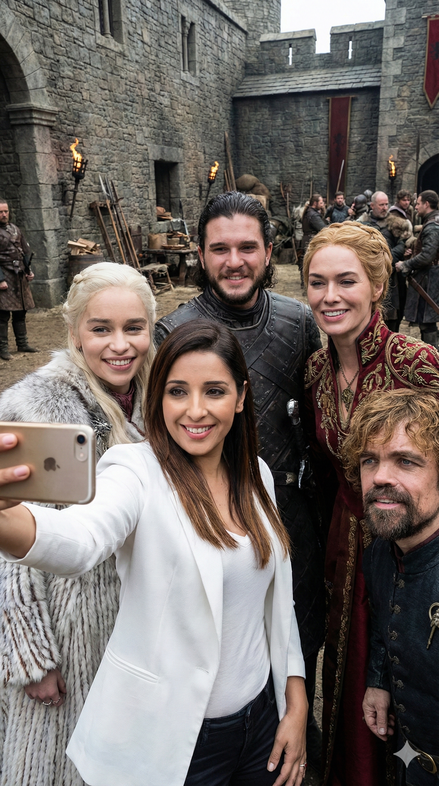 I'm taking a selfie with The main actors from the film on the set of (movie) while holding a glass of wine and making a toast. Keep the person exactly as shown in the reference image with 100% identical facial features... [המשך הפרומפט הרגיל]