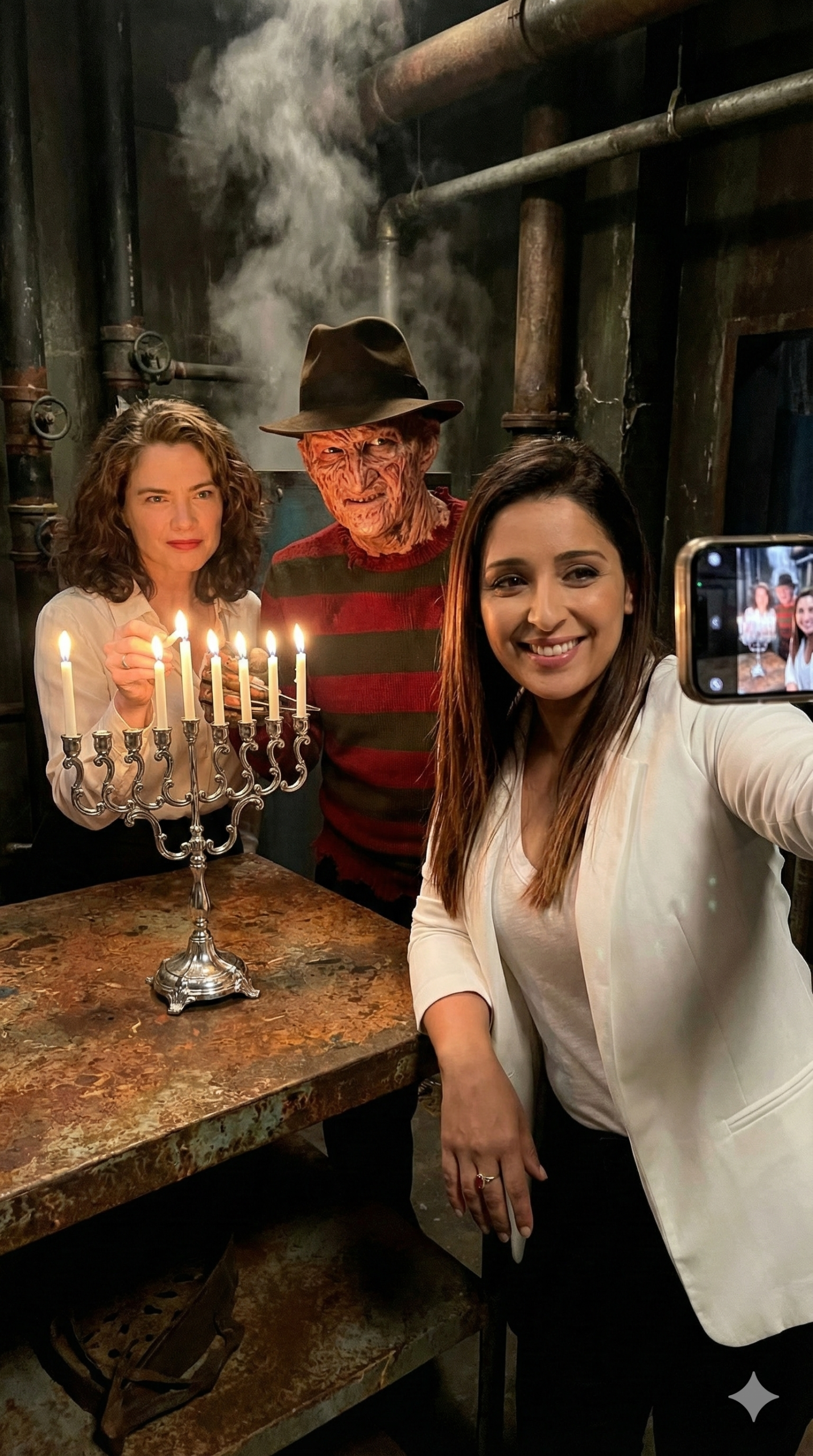 I'm taking a selfie with The main actors from the film on the set of (A Nightmare on Elm Street) When they light a Hanukkah chanukia. Keep the person exactly as shown... [המשך הפרומפט הרגיל]