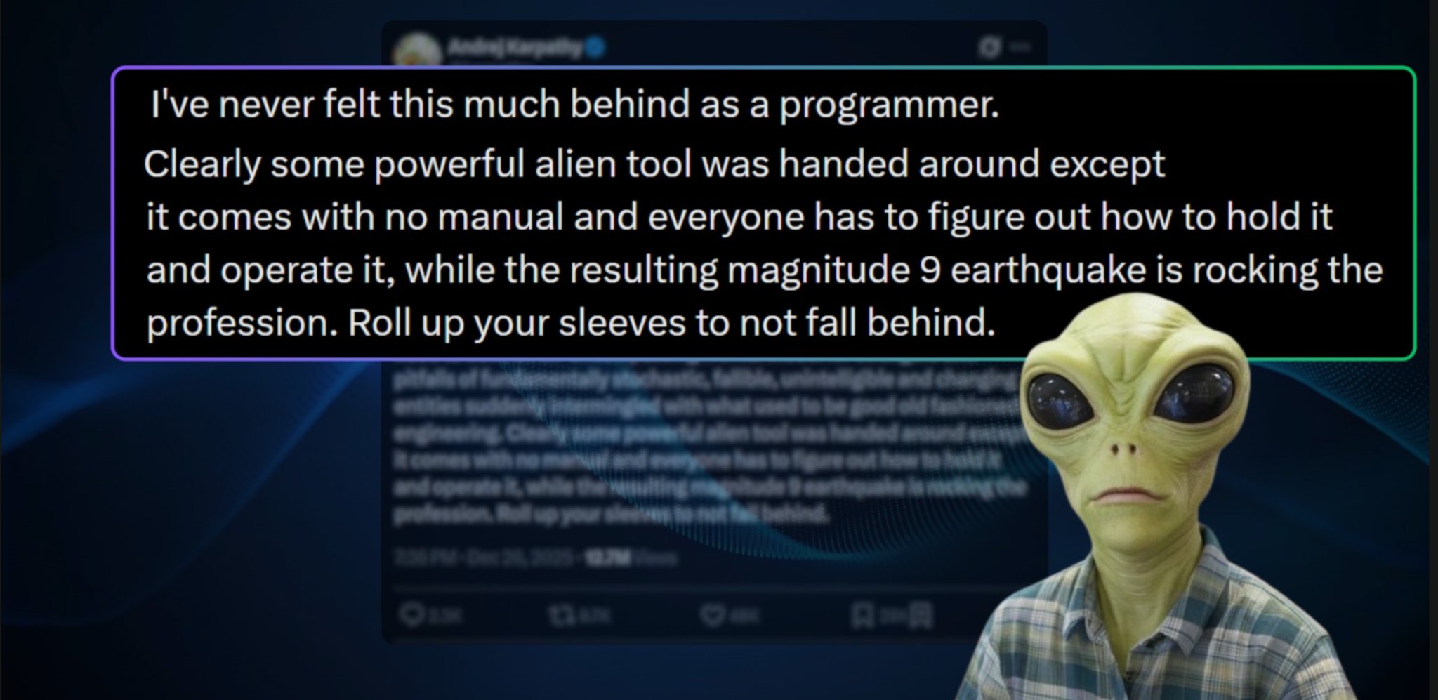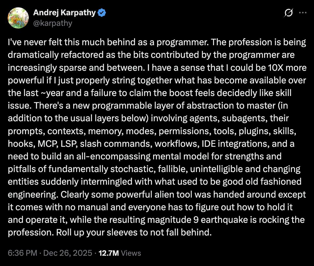 יש משפט אחד שתפס השבוע את קהילת הפיתוח בגרון: “מעולם לא הרגשתי כל כך מאחור כמתכנת”. הדובר הוא אנדריי קרפאתי, ממייסדי OpenAI והאיש שהוביל את ה-AI בטסלה. כשאדם ברמה הזו מודה שהוא מרגיש שהוא לא עומד בקצב, האינסטינקט של כולנו הוא להיבהל. אם הוא מאחור, מה נגיד אנחנו? אבל כאן מגיע הטוויסט: הציוץ שלו לא באמת אומר “אנחנו מפסידים”. הוא אומר “תנאי המגרש השתנו”. וזה בדיוק מה שאמור להרגיע אתכם. כי כשכללי המשחק מתחלפים באמצע, הפער שאתם מרגישים הוא לא פער של יכולת – הוא פער של מודל עבודה.