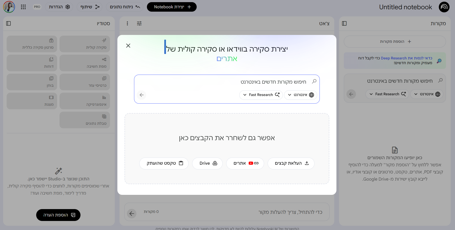 נכנסים ל-NotebookLM דרך החשבון המאובטח. יוצרים מחברת חדשה ובקצה ימני עליון של הממשק נחליף את שם המחברת, למשל: “תיק משפחה פלוני – מזונות”.