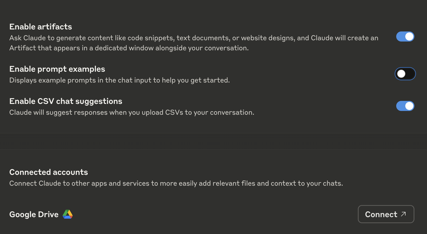 4. הפעלת אפשרויות מתקדמות: בתחתית אותו מסך ההגדרות של Claude, תוכלו למצוא מספר כלים חכמים שיהפכו את חווית השימוש שלכם ליעילה יותר. החל מיצירת תוצרים כמו קוד ועיצובים שיופיעו בחלון נפרד, דרך הצגת דוגמאות פרומפט שימושיות להתחיל שיחה עם הצ’אט, ועד לניתוח אוטומטי של קבצי CSV. בנוסף, תוכלו לחבר את Google Drive כדי לשתף בקלות קבצים רלוונטיים לשיחות שלכם. כל האפשרויות הללו מוצגות בממשק נקי ופשוט עם מתגים שמאפשרים הפעלה וכיבוי מהיר. עבור התוצרים במדריך הזה ותוצרים דומים, נדרש להפעיל את מתג ה- Artifacts ומתג ה- CSV.