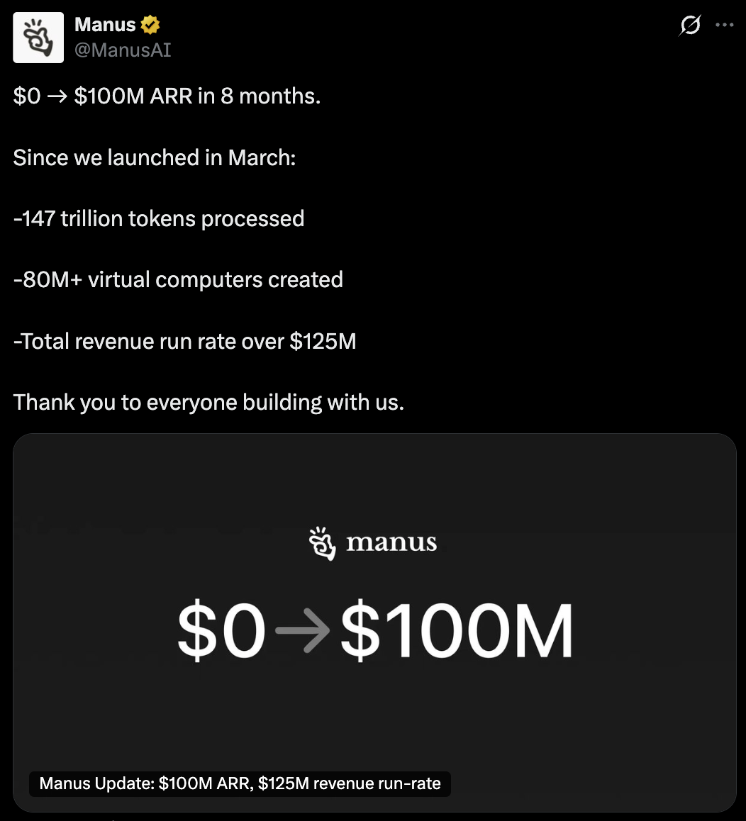 בדצמבר פרסמה Manus פוסט שבו טענה כי הגיעה ל-ARR של כ-100 מיליון דולר, וכי קצב ההכנסות הכולל שלה עבר 125 מיליון דולר. נתונים דומים הופיעו גם בדיווחים של Investing.com ובלוגים טכנולוגיים, כולם בהסתמך על דיווח עצמי של החברה.