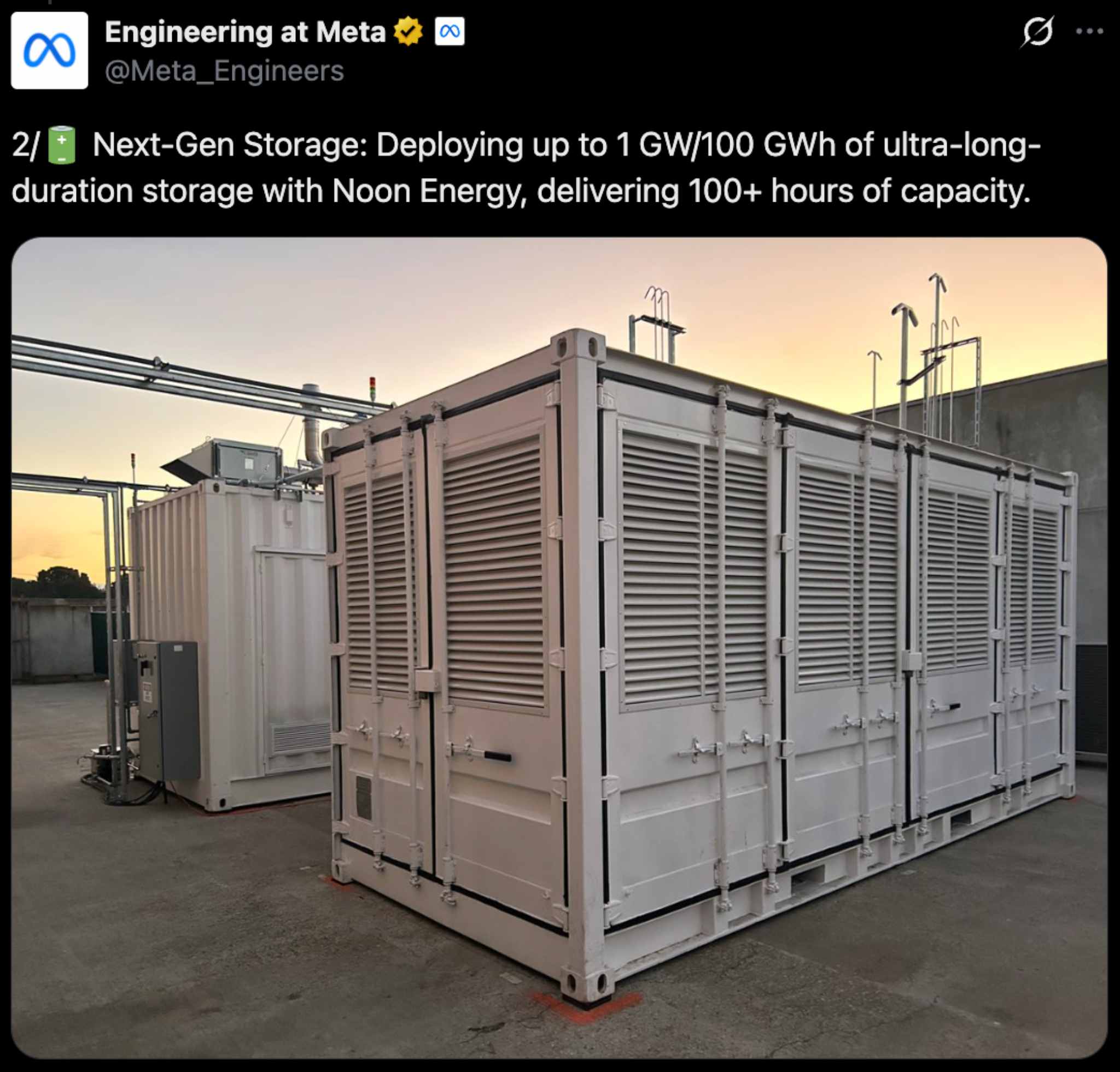 כדי להתמודד עם הפער הזה, מטא בחרה בשילוב בין שתי טכנולוגיות משלימות: אנרגיה סולארית שמגיעה מהחלל בשיתוף Overview Energy, ואגירה ארוכת טווח בהיקף ג׳יגה-ואט בשיתוף Noon Energy. המטרה היא ליצור מקור חשמל נקי שפועל מסביב לשעון. הדגמה ראשונה מתוכננת ל‑2028, ואספקה מסחרית עשויה להתחיל בתחילת העשור הבא.