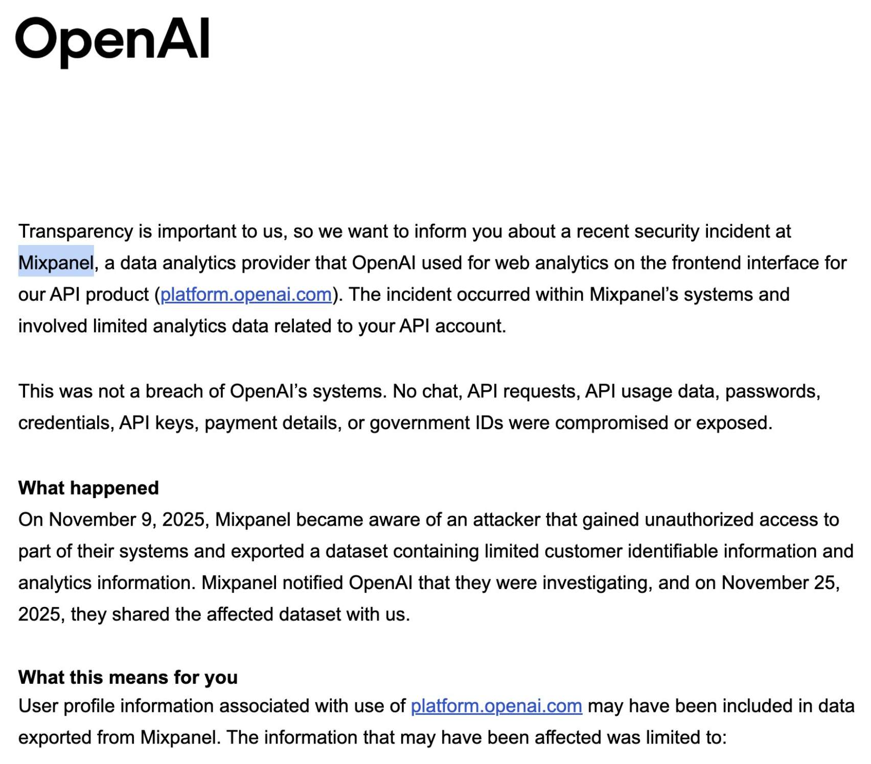 הסיפור מתחיל בתחילת נובמבר, כאשר Mixpanel זיהתה תוקף שהצליח להיכנס לאזור מסוים במערכות שלה ולייצא משם מידע. רק לקראת סוף החודש העבירה החברה ל-OpenAI את הדאטה שנחשף, מה שאיפשר לחוקרי האבטחה של OpenAI להבין מה בדיוק יצא החוצה.