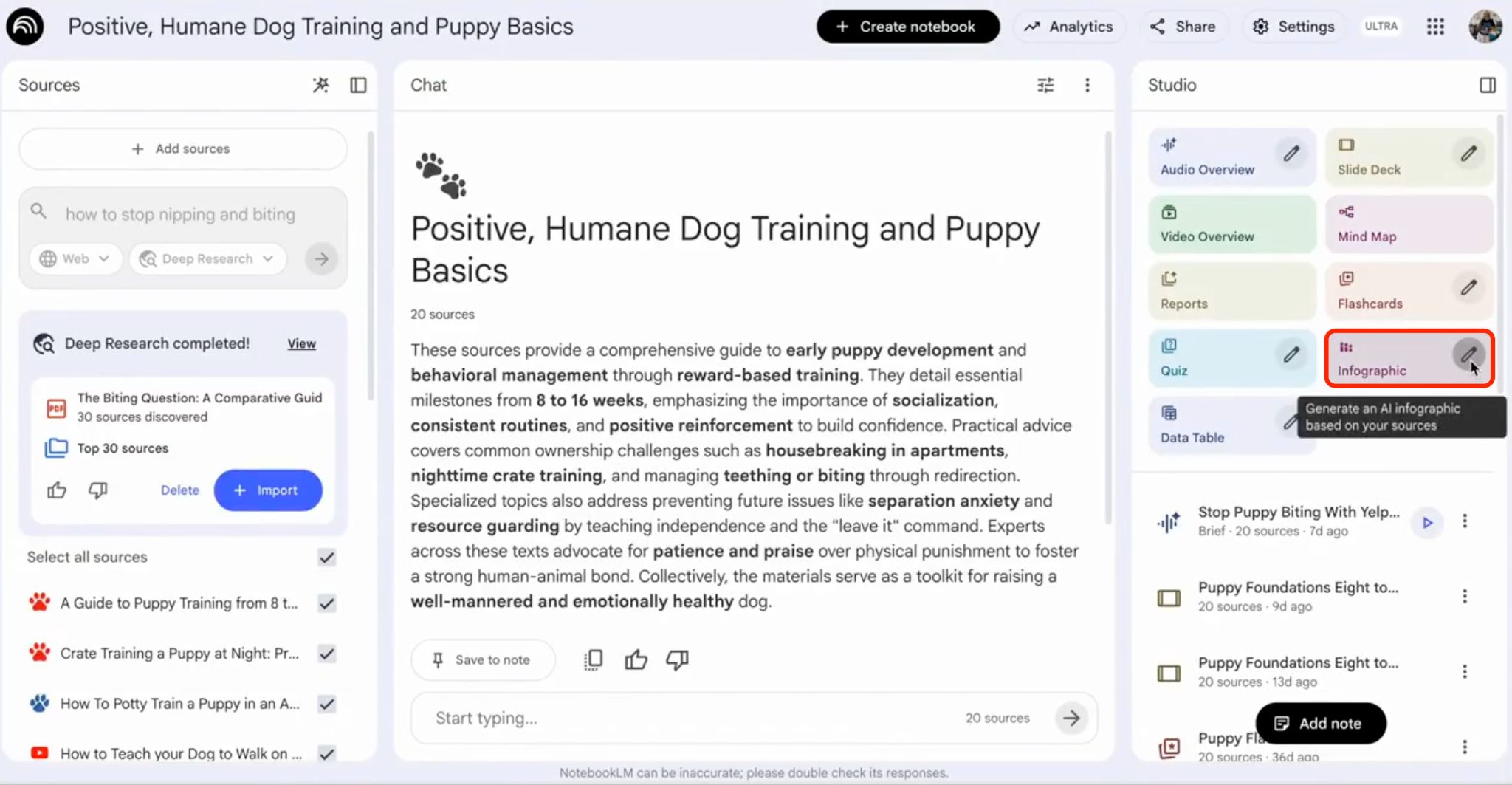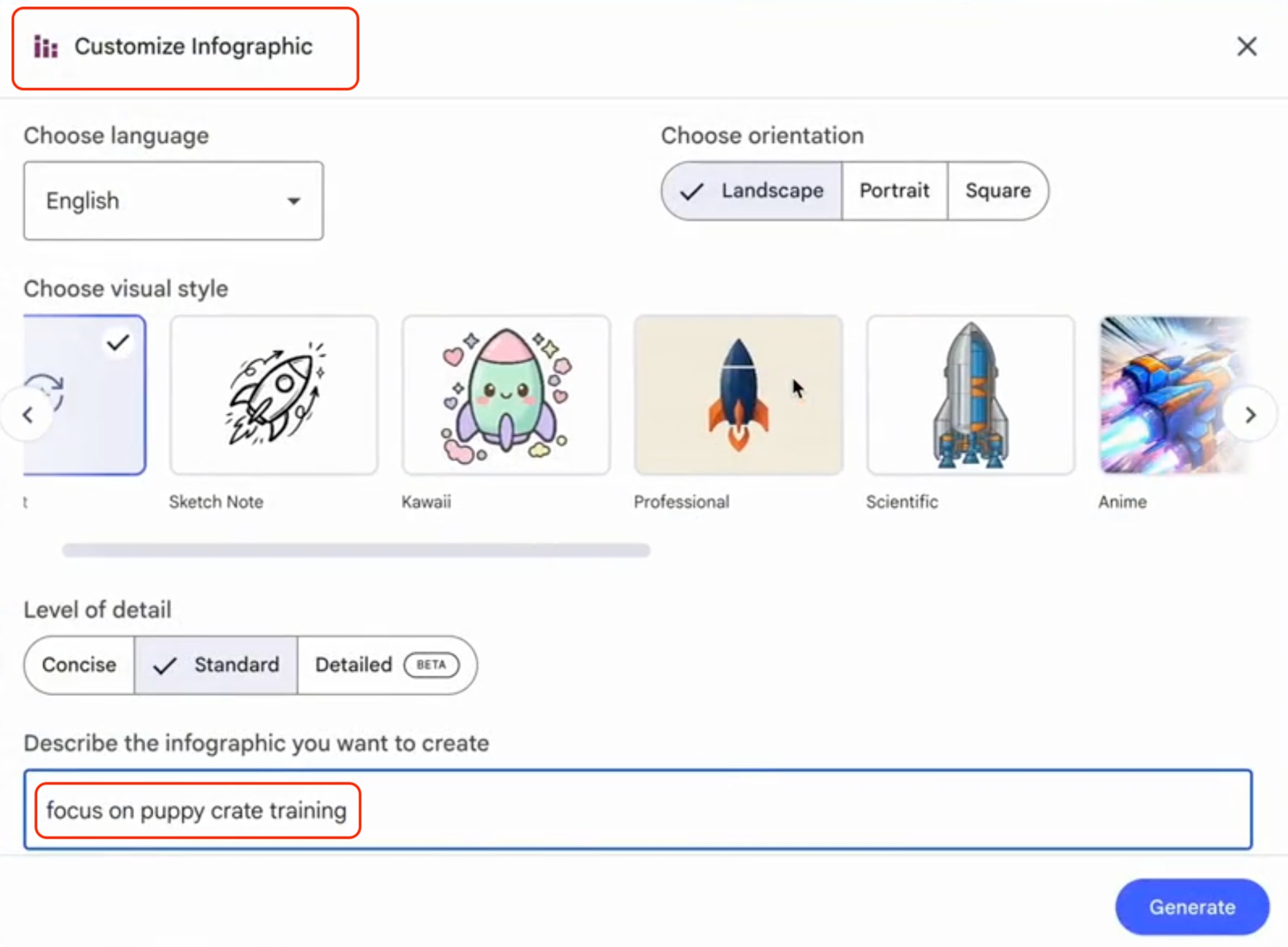 התהליך פשוט ומוכר למי שעובד עם NotebookLM באופן קבוע. מעלים מסמכים לאיזור המקורות (Sources), בוחרים דרך הסטודיו (Studio) ביצירת אינפוגרפיקה, ואז בוחרים סגנון. המערכת מנתחת את התוכן ומייצרת אינפוגרפיקה שמסדרת את המידע בצורה ויזואלית. אפשר להגדיר גם כיוון (לרוחב, לאורך או ריבוע), רמת פירוט ושפה.