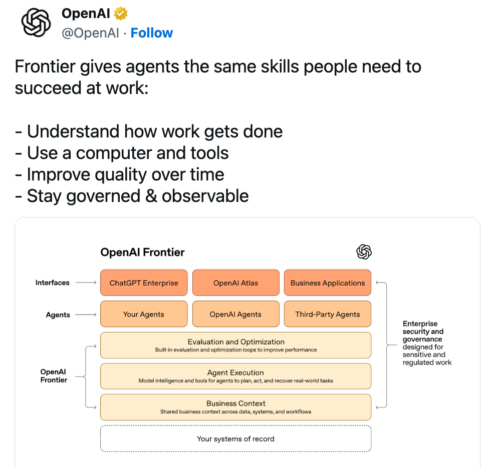 OpenAI בוחרת כעת להרחיב את גבולות המשחק. במקום להשיק מודל חדש, היא מציגה שכבת תשתית שלמה: Frontier, פלטפורמה ארגונית לניהול, הפעלה וממשל של סוכני בינה מלאכותית הפועלים בתוך מערכות אמיתיות.