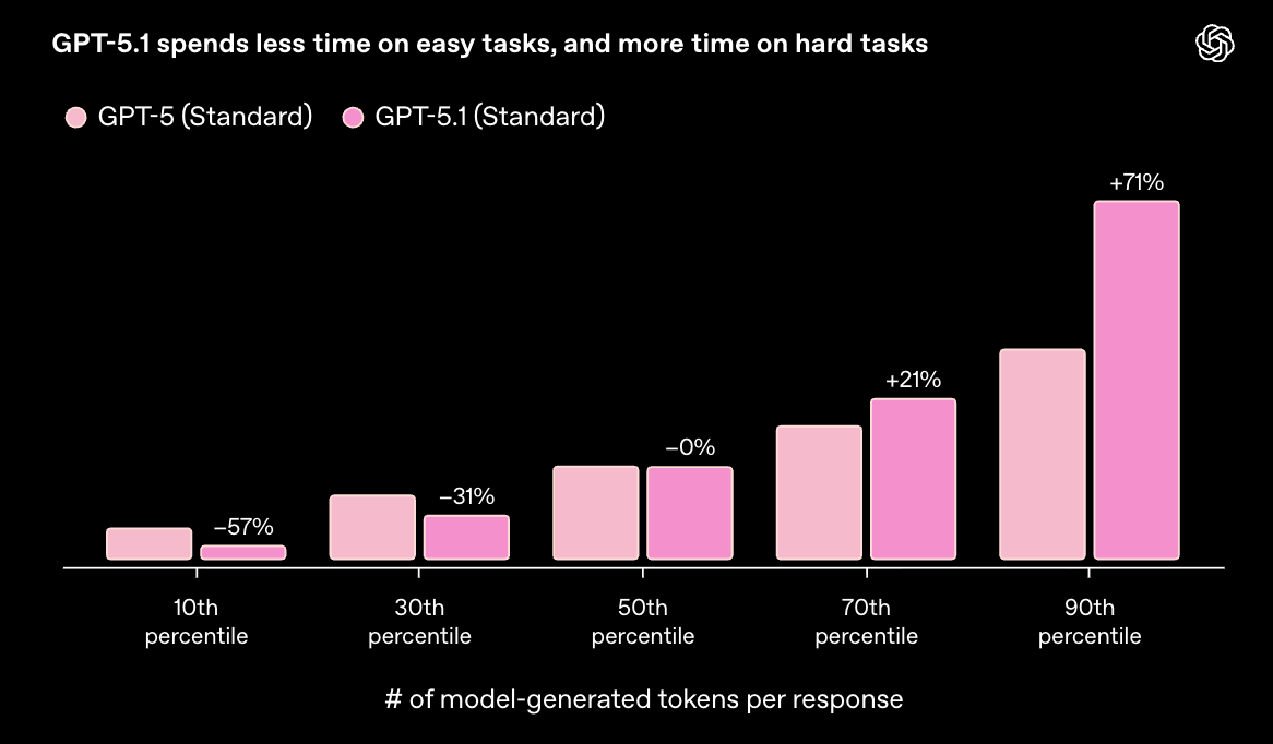הגרף המצורף מציג את הפערים בזמן התגובה בין GPT-5 לבין GPT-5.1 במשימות ברמות קושי שונות. בצד שמאל ניתן לראות ש-GPT-5.1 מהיר בהרבה במשימות פשוטות, עם ירידה משמעותית בכמות הטוקנים שהמודל מייצר. ככל שהמשימות נעשות מורכבות יותר, בצד ימין של הגרף, GPT-5.1 מייצר יותר טוקנים ומקדיש יותר זמן חשיבה. כך מתקבל מודל שמגיב מהר יותר כשאפשר, ומעמיק יותר כשהמשימה דורשת זאת: