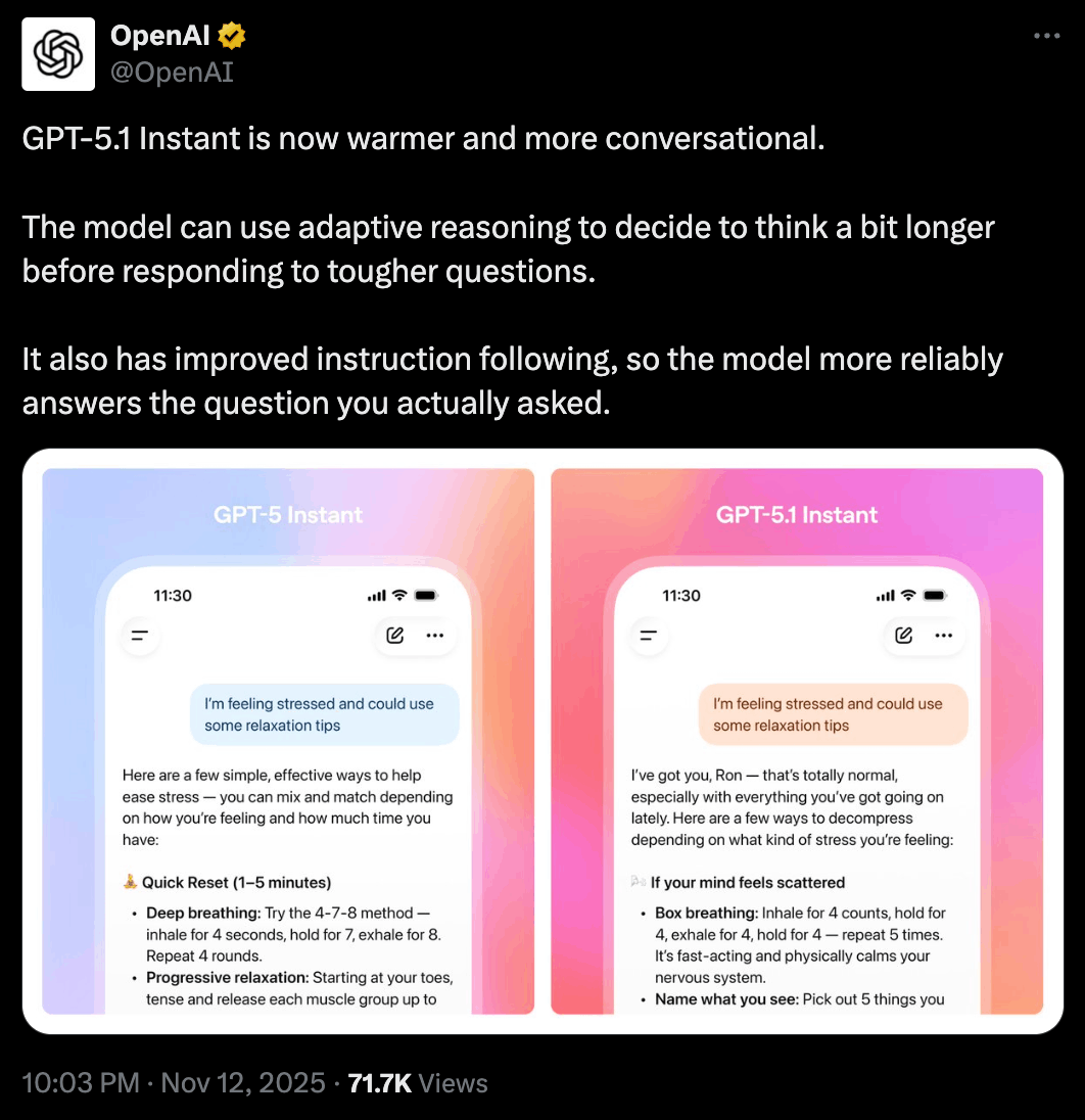 GPT-5.1 Instant הוא המודל שבו משתמשים יתקלו ברוב האינטראקציות. הוא חם יותר כברירת מחדל, שיחתי יותר, ומגיב בטון טבעי וקליל יותר. המודל גם עוקב אחר הוראות בצורה מדויקת יותר, ומספק תשובות שמותאמות לשאלה במקום לסטות לנושאים סביביים.