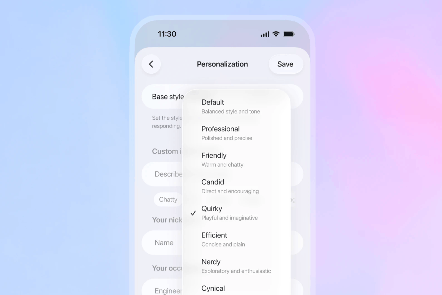 האפשרויות כוללות כעת: Default, Friendly (Listener לשעבר), Efficient (Robot לשעבר), Professional, Candid, Quirky. בנוסף, שתי פרסונות ותיקות – Cynical ו-Nerdy – נשארות במקומן.