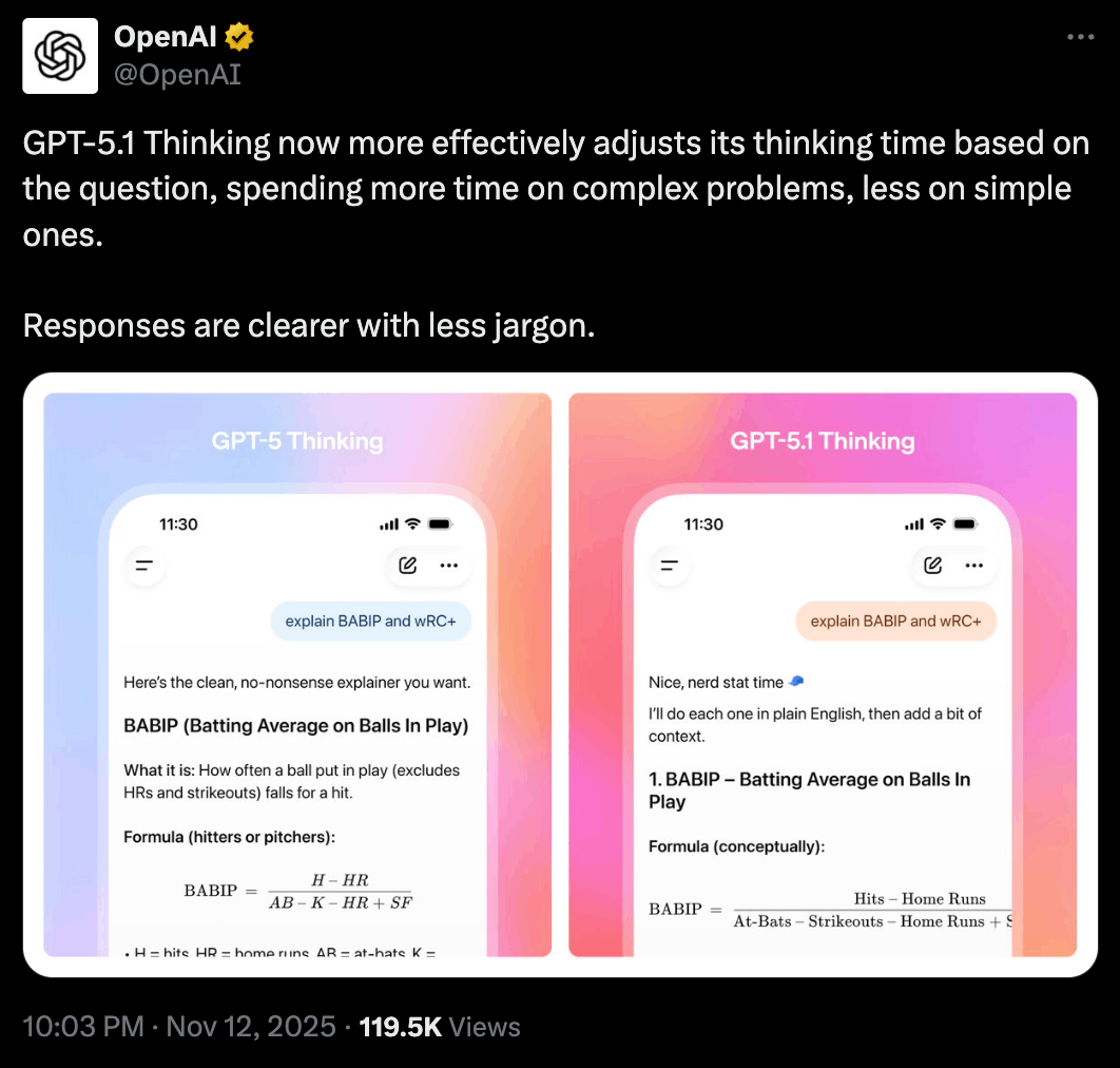GPT-5.1 Thinking, לעומתו, מיועד למשתמשים שנדרשים לניתוח עמוק. הוא מתאים את זמן החשיבה ביתר דיוק למורכבות השאלה. פחות המתנה כשמדובר בשאלות יומיומיות, יותר עומק כשנדרשת חשיבה מורכבת. מעבר לכך, התשובות שלו ברורות יותר ופחות עמוסות בז’רגון. OpenAI מציינת שהמודל כברירת מחדל חם ואמפטי יותר, כדי לאפשר עבודה נעימה גם במקרים שבהם נדרש הסבר טכני.