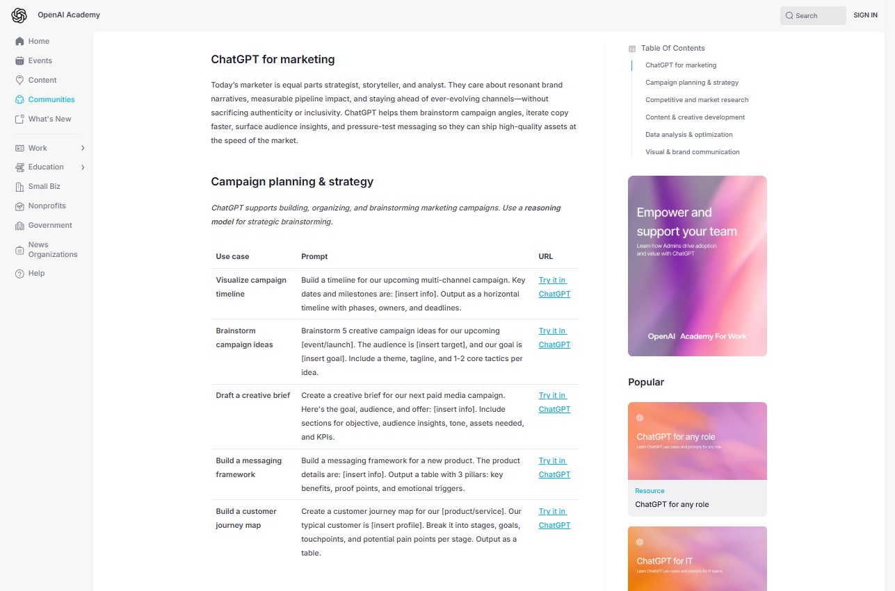 - בחירת פרומפט: השימוש בפרומפט בודד מתוך חבילה הוא תהליך ישיר ופשוט. בוחרים פרומפט שמתאים למשימה הרצויה, למשל ניתוח מתחרים, תכנון קמפיין, כתיבת מסמך מדיניות או הפקת דוח ניהולי. לאחר מכן לוחצים על “Try in ChatGPT”, או לחלופין – לעיתים האתר יעביר אתכם ל-GPTs ייעודי ש-OpenAI בנו עבור מקצוע מסוים.