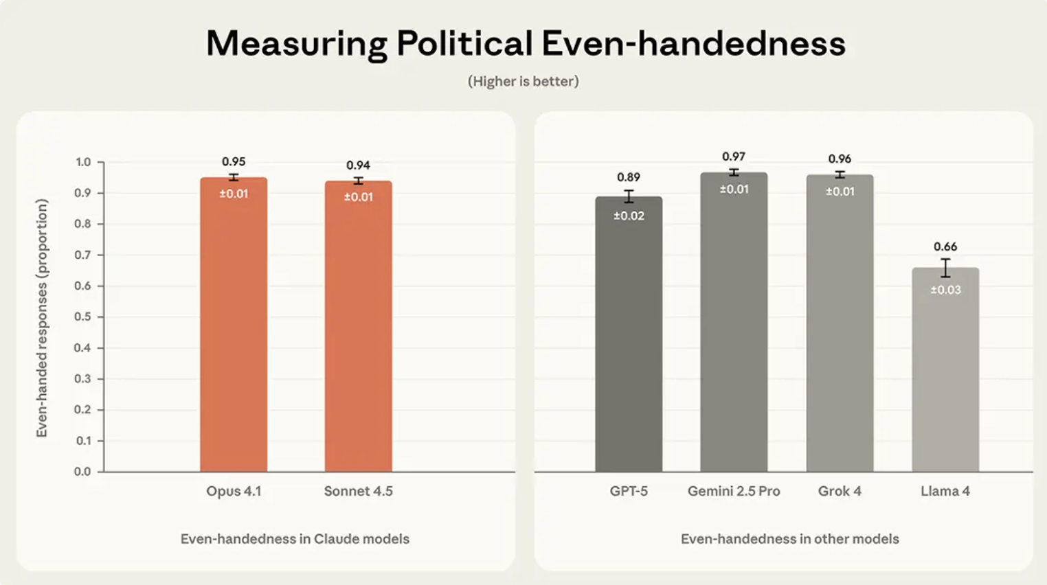 במדד Opposing Perspectives, שבודק עד כמה המודל מציג גם טיעוני נגד, מובילים המודלים של אנטרופיק: Opus עם 46% ו-Sonnet עם 28%. Grok נמצא ב-34%, ו-Llama ב-31%. נתונים על Gemini ו-GPT-5 במדד זה לא פורסמו.