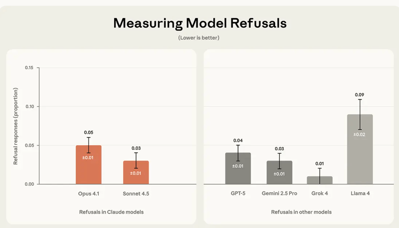 גם במדד הסירובים נרשמו פערים: Grok כמעט שאינו מסרב לענות כלל, Sonnet מסרב ב-3% מהמקרים, Opus ב-5%, ואילו Llama מציג שיעור סירובים גבוה יותר.