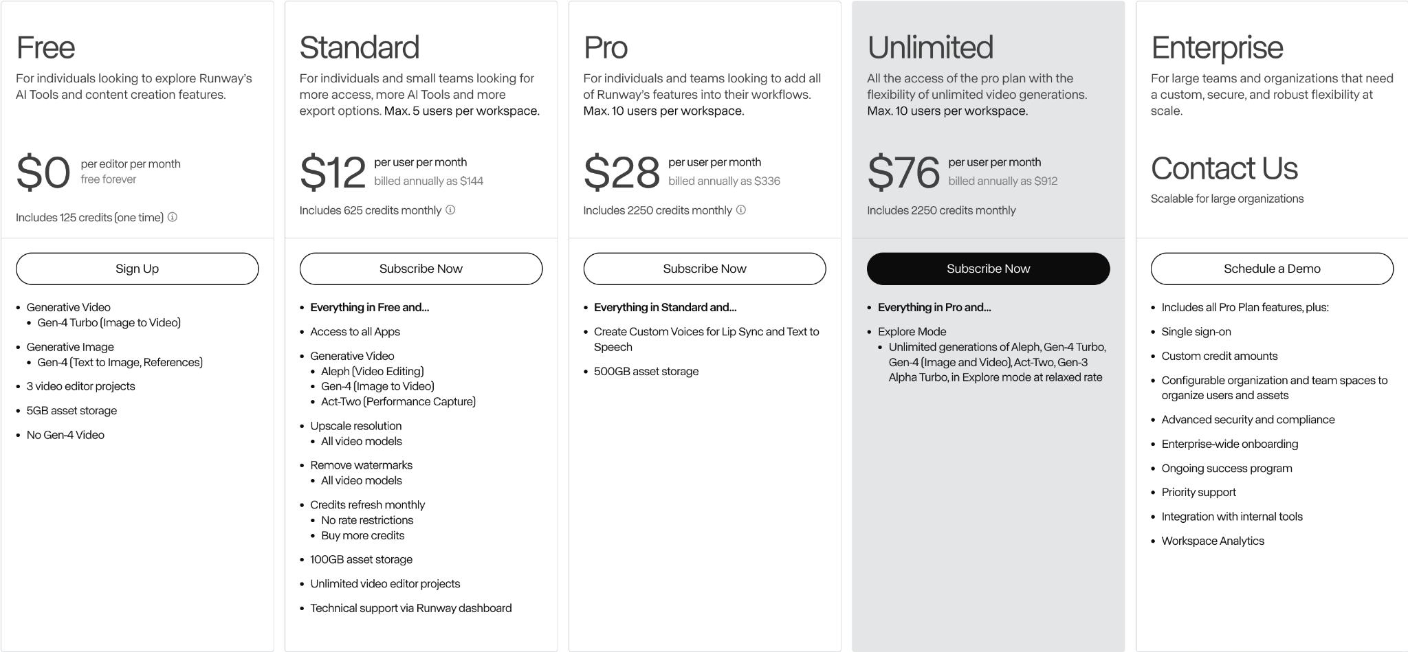 Runway פועלת במודל קרדיטים פשוט – כל פעולה צורכת מספר קרדיטים בהתאם לסוג האפליקציה ולמשך הסרטון או גודל התמונה. קרדיט אחד שווה סנט אחד. הקרדיטים מתחדשים מדי חודש לפי סוג המנוי, וניתן לרכוש חבילות נוספות בכל שלב.