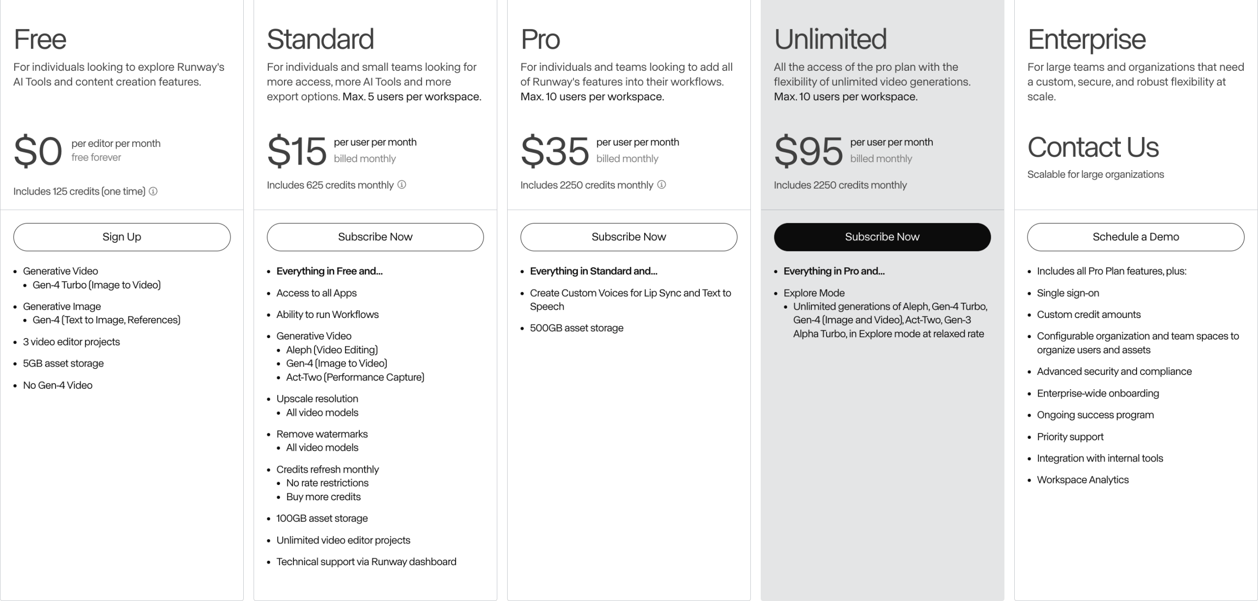 Runway ממשיכה לעבוד במודל של מנוי חודשי + קרדיטים. Runway מצהירה ש-Gen-4.5 זמין במחירים “דומים” ל-Gen-4, כלומר משתמשים בתכניות בתשלום צפויים לראות את המודל החדש כחלק מאותו סל קרדיטים, בלי תמחור חריג.
