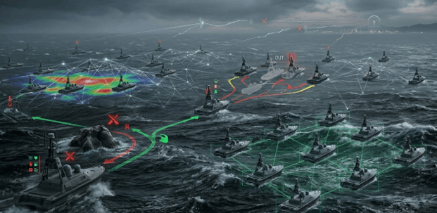 השכבה השנייה היא בקרה וניווט. כאן לא מדובר רק ביכולת להחזיק קו, אלא ביכולת לתכנן מסלול מחדש בזמן אמת. מערכות כאלה משלבות מתכנני מסלול קלאסיים עם שיטות הסתגלותיות יותר, ולעיתים גם עם למידת חיזוק, כדי להתמודד עם מכשולים, ים דינמי, כללי COLREGs, ומגבלות תנועה של כלי קטן. הסקירות האחרונות בתחום מדגישות מגמה ברורה: מעבר ממערכות ניווט “קשיחות” יחסית למערכות guidance and control שיש בהן שכבה data-driven ולמידה מבוססת ניסיון. במערך להקתי, זה מתרחב מהשאלה “לאן אני מפליג?” לשאלה “איך אני מפליג כך שהקבוצה כולה תשמור על המבנה ועל המשימה?”.
