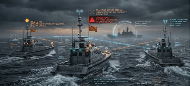 גם הניווט אינו מובן מאליו; תוכנית SBIR של הצי האמריקאי (שנחשב המתקדם בעולם) הגדירה צורך בטכנולוגיות מיקום פסיביות כאשר GPS נפגע או אינו זמין, והדגישה כי הטכנולוגיה הקיימת יכולה רק “למתוח זמן” לפני שהשגיאה מצטברת גורמת לכלי לצאת מהמסלול. לכן, בים, השאלה איננה האם נוח להוסיף AI, אלא איך שומרים על משימה כאשר הקישור לא אמין והניווט חלקי. אם כל שינוי מסלול, העברת תפקיד או תגובה לאיום חייבים לעבור דרך מפעיל אנושי, הלהקה כולה נהפכת לשברירית.