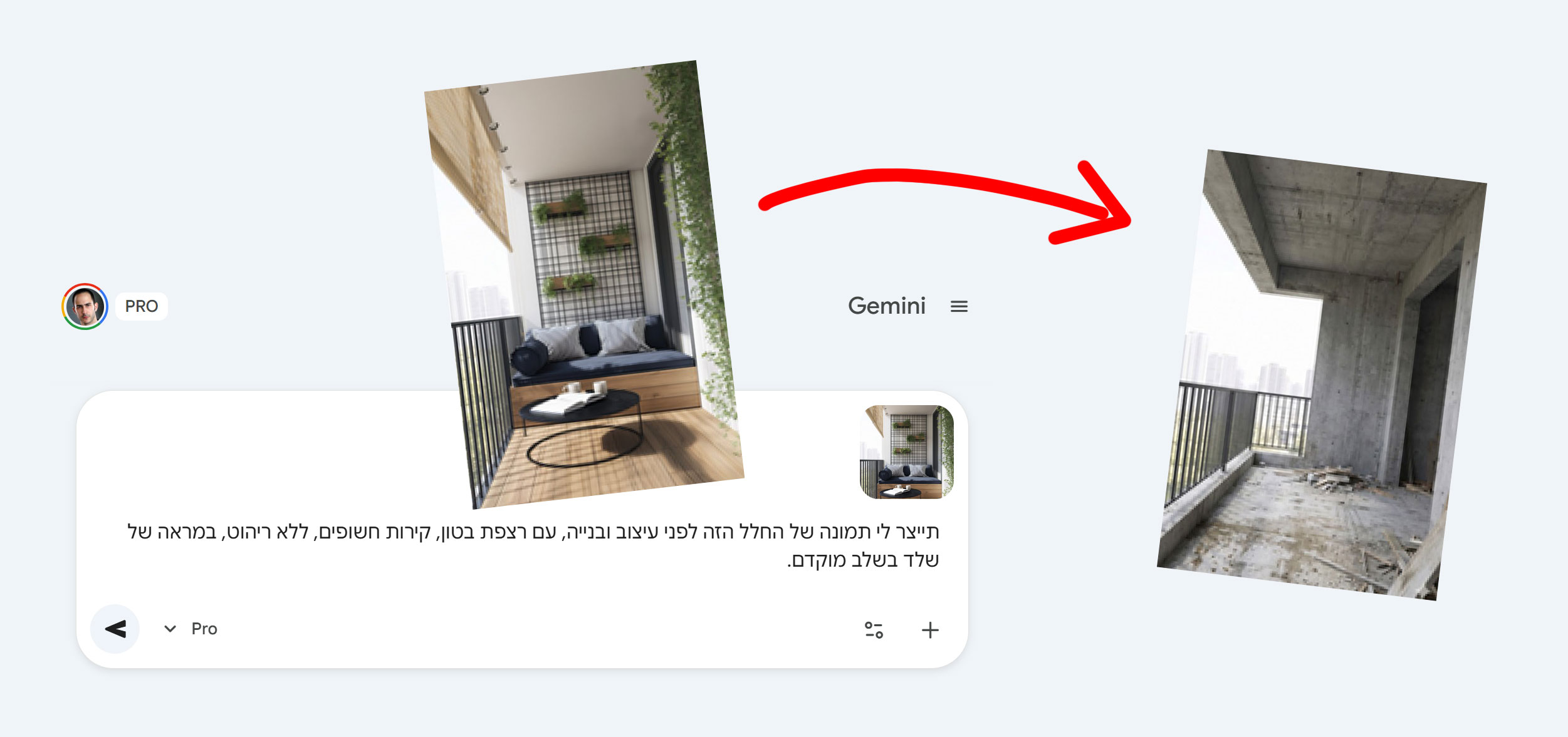 מתחילים מתמונה של החלל המעוצב או ההדמיה הסופית. מכניסים אותה לג׳מיניי וכותבים פרומפט שמחזיר את החלל אחורה, לשלב שלפני שיפוץ ובנייה.