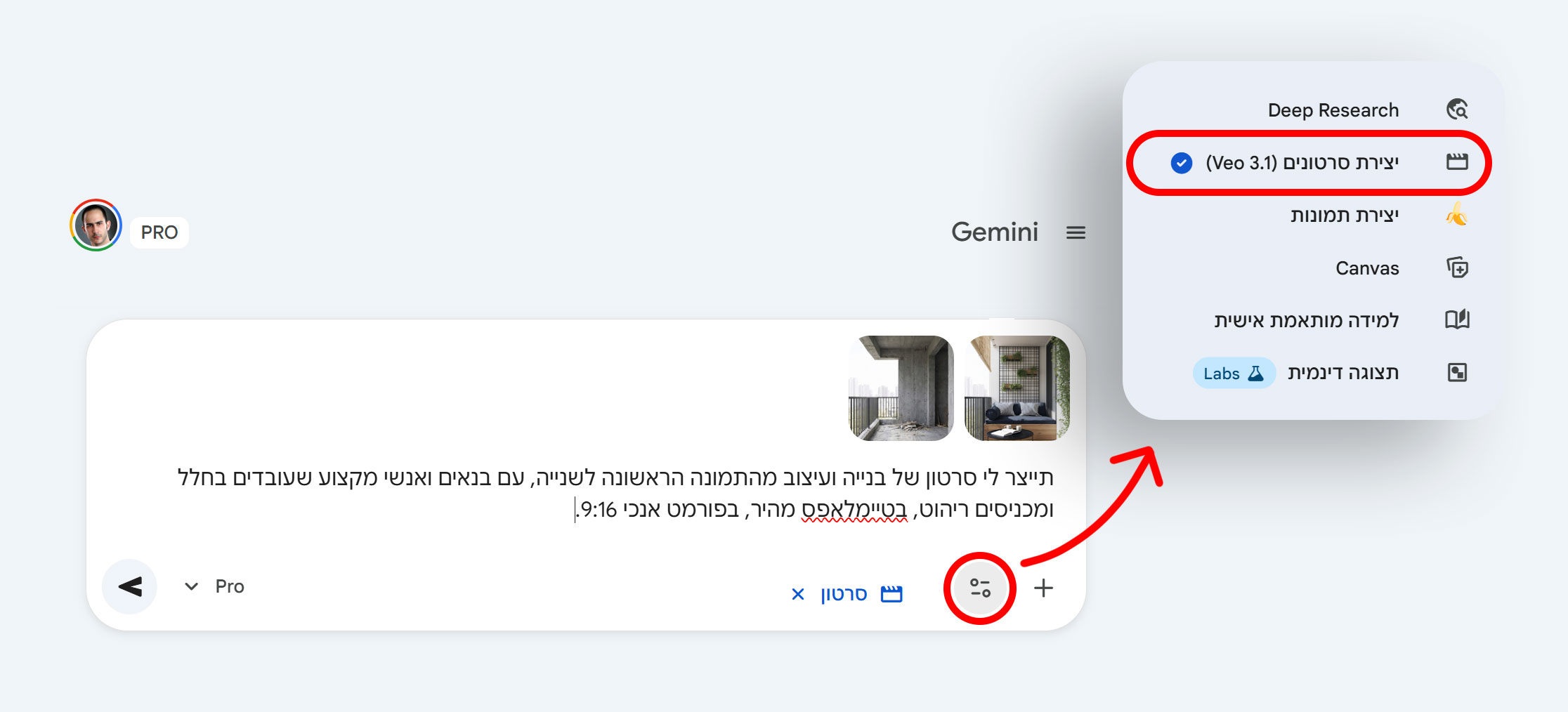 עכשיו מייצרים את הסרטון המרכזי. מכניסים לג׳ימיני את שתי התמונות – ה”לפני” וה”אחרי”. בוחרים בכלי יצירת סרטון (מודלי Veo של גוגל) וכותבים פרומפט שמדגיש תהליך, תנועה ואנשי מקצוע.
