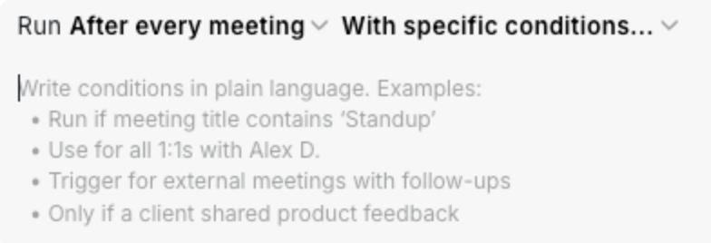 5. קובעים מתי הוא ירוץ: אפשר לבחור שירוץ רק כשמבקשים, או אוטומטית אחרי כל פגישה. לדוגמה: “תרוץ רק אם הלקוח אמר ‘שלח לי הצעת מחיר’.”
