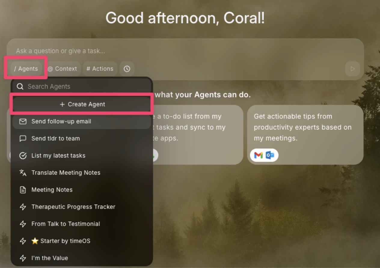 1. פותחים את בונה הסוכנים (Agent Builder): מהמסך הראשי, הקלידו “/Agents” או לחצו על הכפתור עם הסמל המתאים. בחרו “Create Agent ➕” כדי להתחיל (כמו בתמונה למעלה).