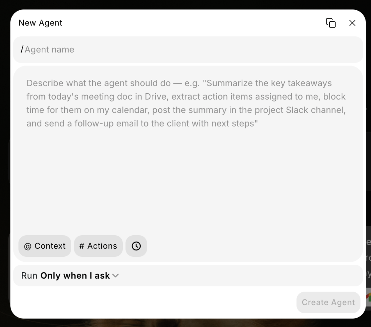 וה-Agents הם הסוכנים עצמם, עוזרים דיגיטליים קטנים שמתמחים במשימות שונות: יצירת מסמך, שליחת מייל, עדכון לוח שנה או כתיבה ב-Notion. אפשר להריץ אותם לפי דרישה, או להגדיר שיפעלו אוטומטית אחרי כל פגישה. התוצאה? מערכת שמבינה הקשר, זוכרת רצף, ופועלת בזמן הנכון.
