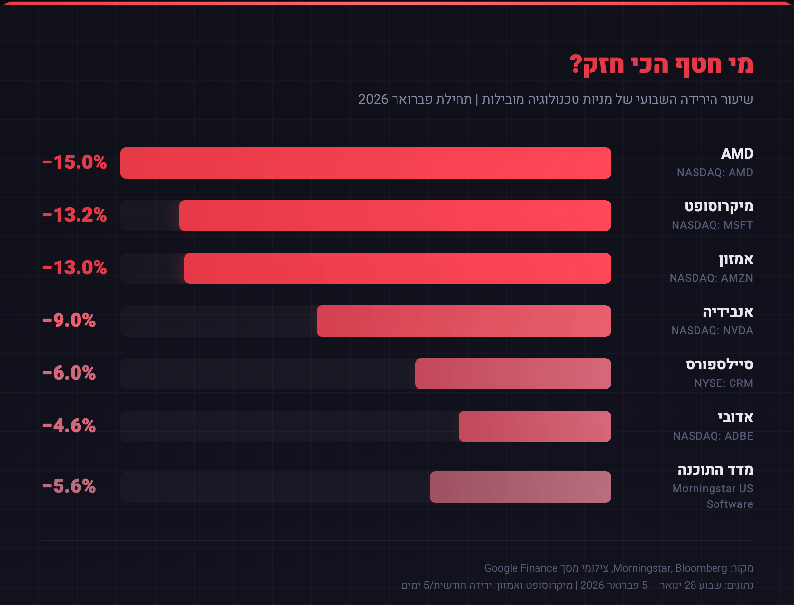 בואו נזרוק קצת מספרים לאוויר, רק כדי שתבינו את גודל המכה. הנאסד”ק? ירד בכמעט 2%. נשמע לכם “בקטנה”? אז זהו, שלא. סקטור התוכנה כולו חטף מכה של כ-6% בשבוע אחד. ענקיות תוכנה ותיקות ויציבות כמו סיילספורס ואדובי איבדו גובה במהירות, ואפילו המלכה הבלתי מעורערת, אנבידיה, השילה 9% מהשווי שלה. גם שוק השבבים לא נותר בטוח. AMD? צללה ב-15%.