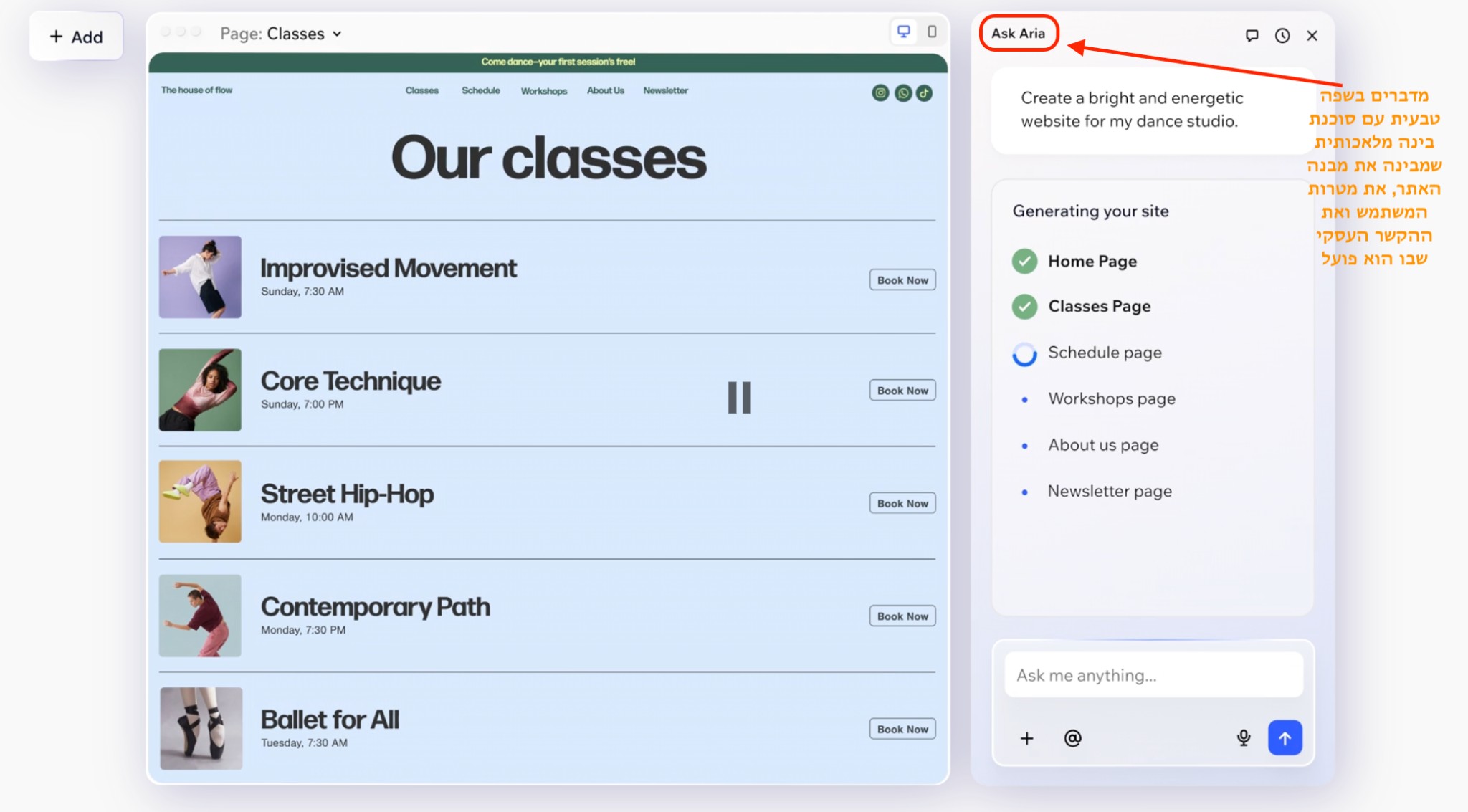 אפשר לבקש מ‑Aria ליצור עמוד שלם, לנסח טקסט לקטע “מי אנחנו” או להציע כיוון עיצובי חדש, ומיד לאחר מכן לעבור לעריכה ידנית: לגרור אלמנטים למיקום מדויק, לשנות פונטים וצבעים, להעלות תמונות אישיות או לכוונן מרווחים עד רמת הפיקסל. השילוב הזה יוצר חוויית עבודה מהירה וגמישה, שמאפשרת לכל משתמש לבחור את אופן העבודה שנוח לו, בלי להינעל על שיטה אחת או על מבנה קשיח של תבנית.